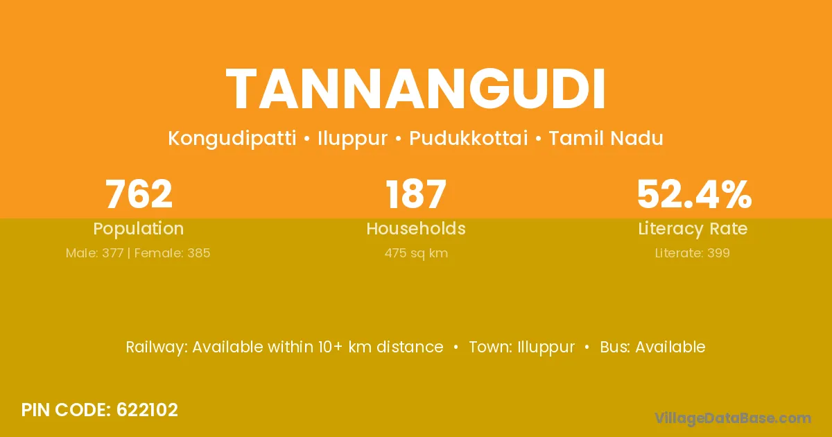 Tannangudi village has a total population of 762 people, of which 377 are males and 385 are females.