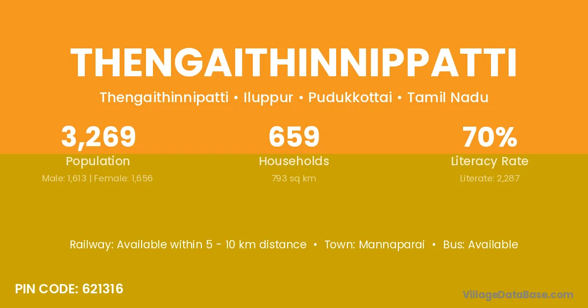 Thengaithinnippatti village has a total population of 3,269 people, of which 1,613 are males and 1,656 are females.