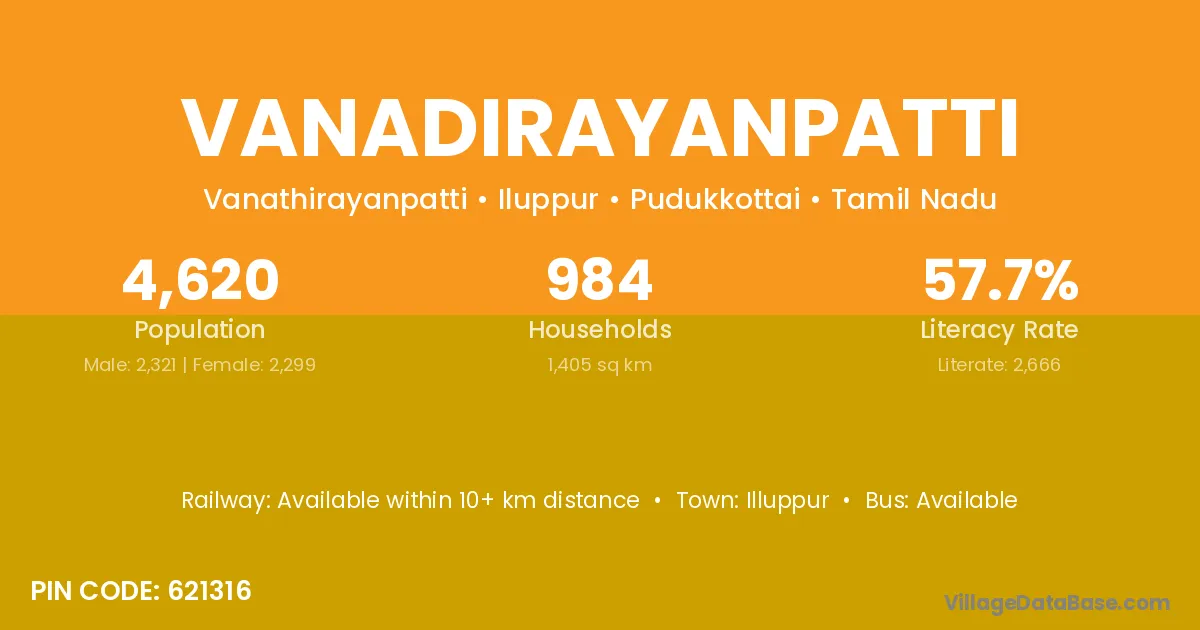 Vanadirayanpatti village has a total population of 4,620 people, of which 2,321 are males and 2,299 are females.
