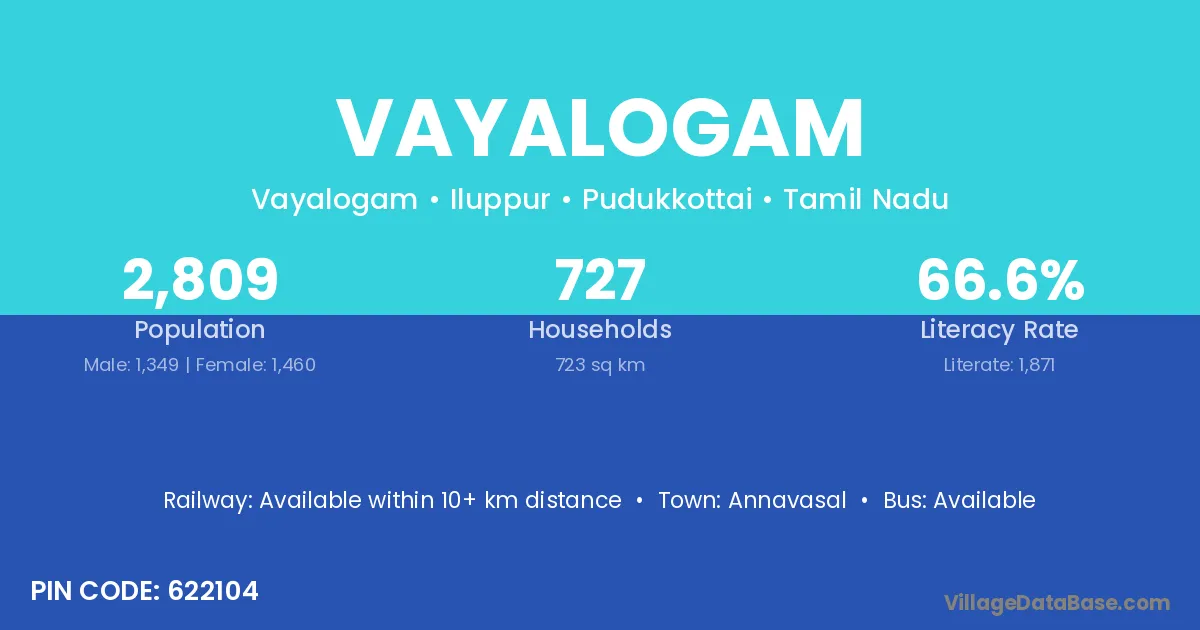 Vayalogam village is located in the Iluppur Taluka of the Pudukkottai district in Tamil Nadu .