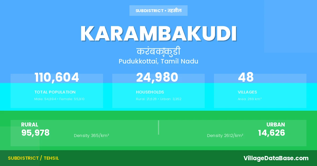 According to the 2011 census The total area of Karambakudi Taluka is 269 km², with a population of 110604 people. The population density is 411 inhabitants per square kilometre, and there are approximately 24980 houses in the sub district.