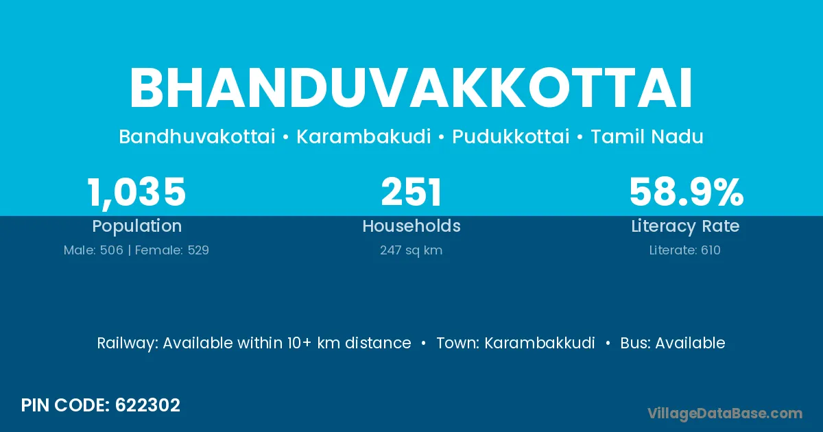 Bhanduvakkottai village has a total population of 1,035 people, of which 506 are males and 529 are females.