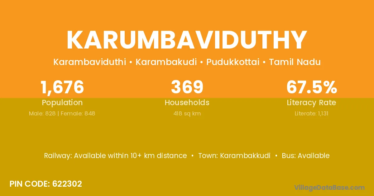 Karambakkudi is the nearest town to Karumbaviduthy village for major economic activities