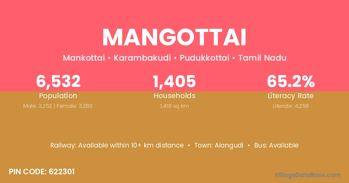 Mangottai village has a total population of 6,532 people, of which 3,252 are males and 3,280 are females.