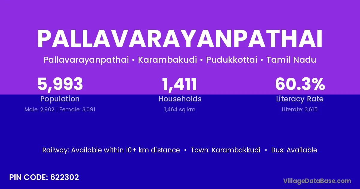 Pallavarayanpathai village has a total population of 5,993 people, of which 2,902 are males and 3,091 are females.