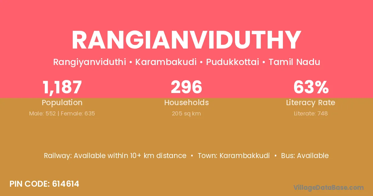 Rangianviduthy village has a total population of 1,187 people, of which 552 are males and 635 are females.
