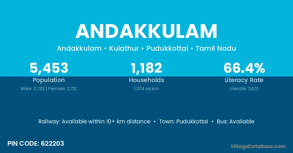 Pudukkottai is the nearest town to Andakkulam village for major economic activities