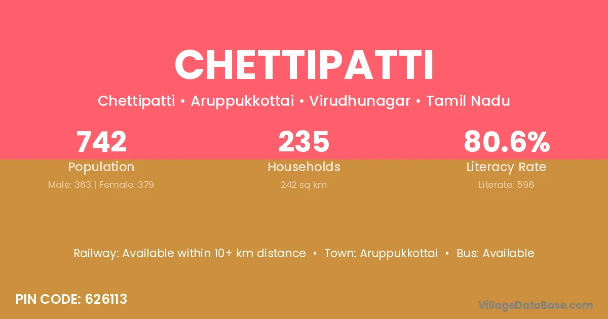 Chettipatti village has a total population of 2,411 people, of which 1,193 are males and 1,218 are females.