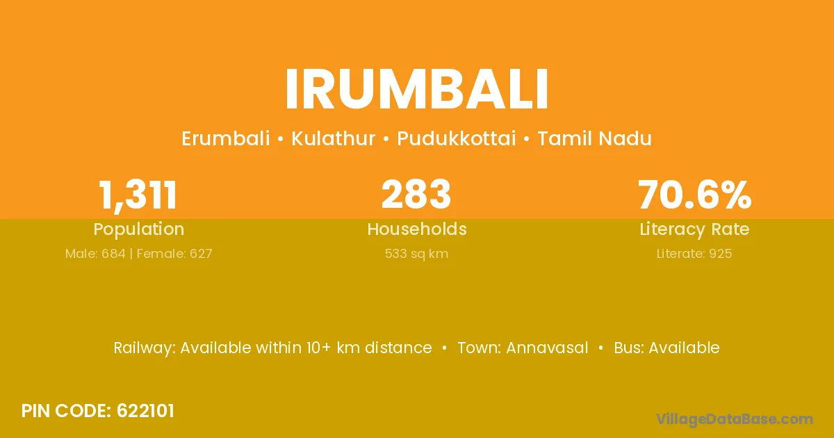 Irumbali village has a total population of 1,311 people, of which 684 are males and 627 are females.