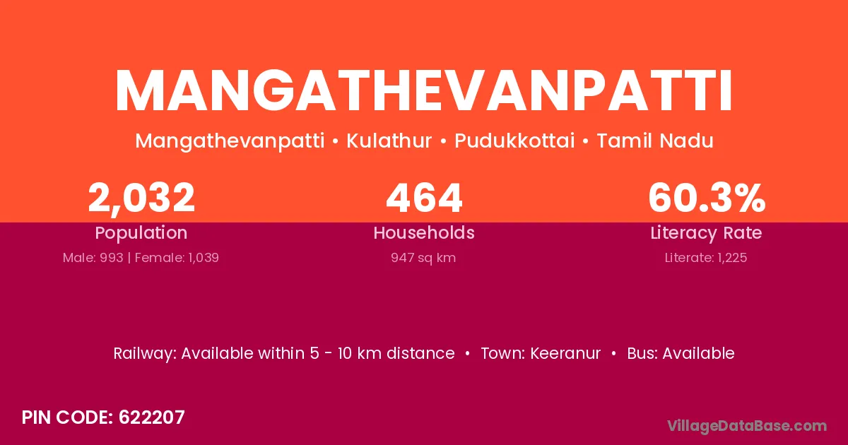 Mangathevanpatti village has a total population of 2,032 people, of which 993 are males and 1,039 are females.