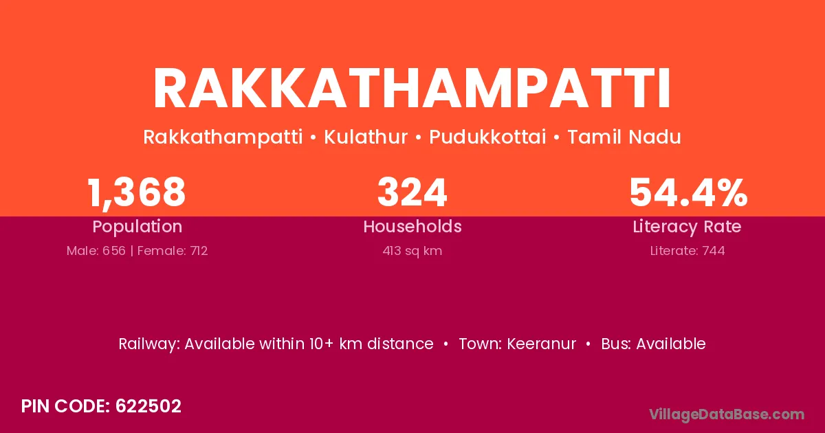 Rakkathampatti village has a total population of 1,368 people, of which 656 are males and 712 are females.