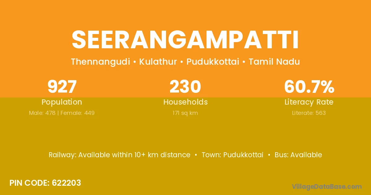 Seerangampatti village has a total population of 927 people, of which 478 are males and 449 are females.