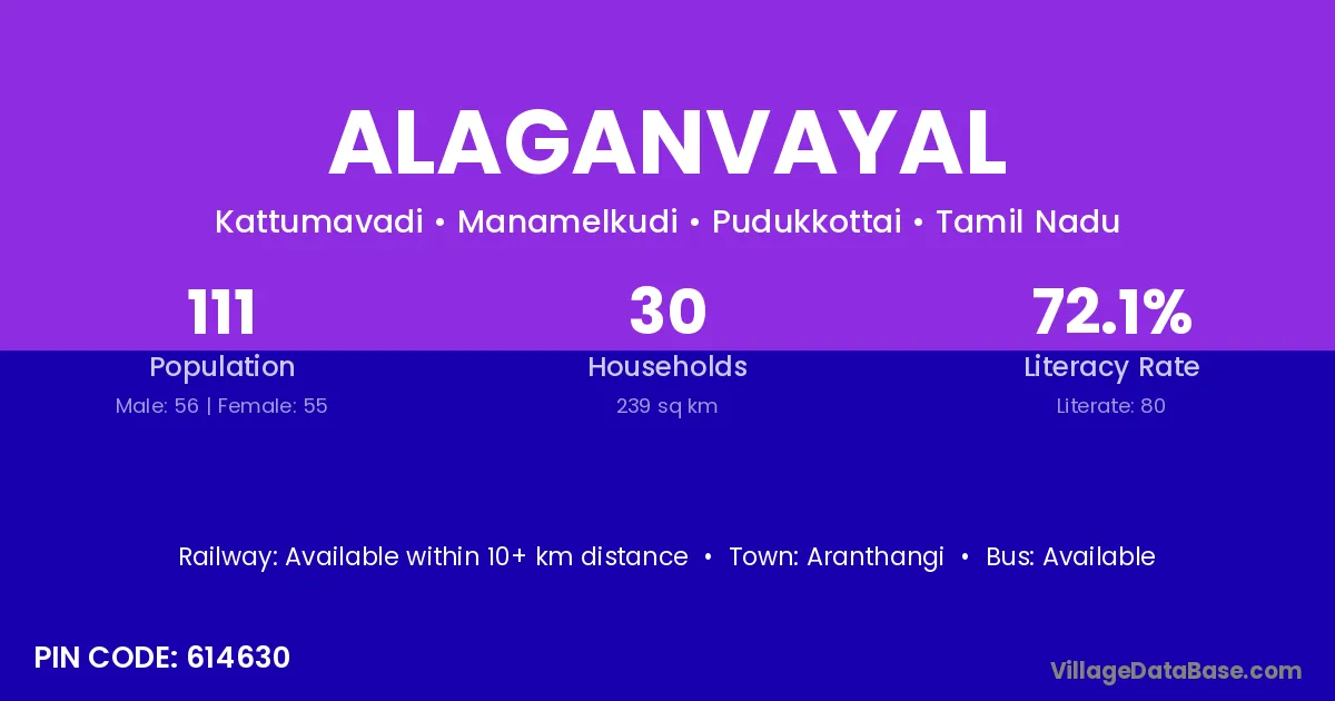 Alaganvayal village has a total population of 111 people, of which 56 are males and 55 are females.