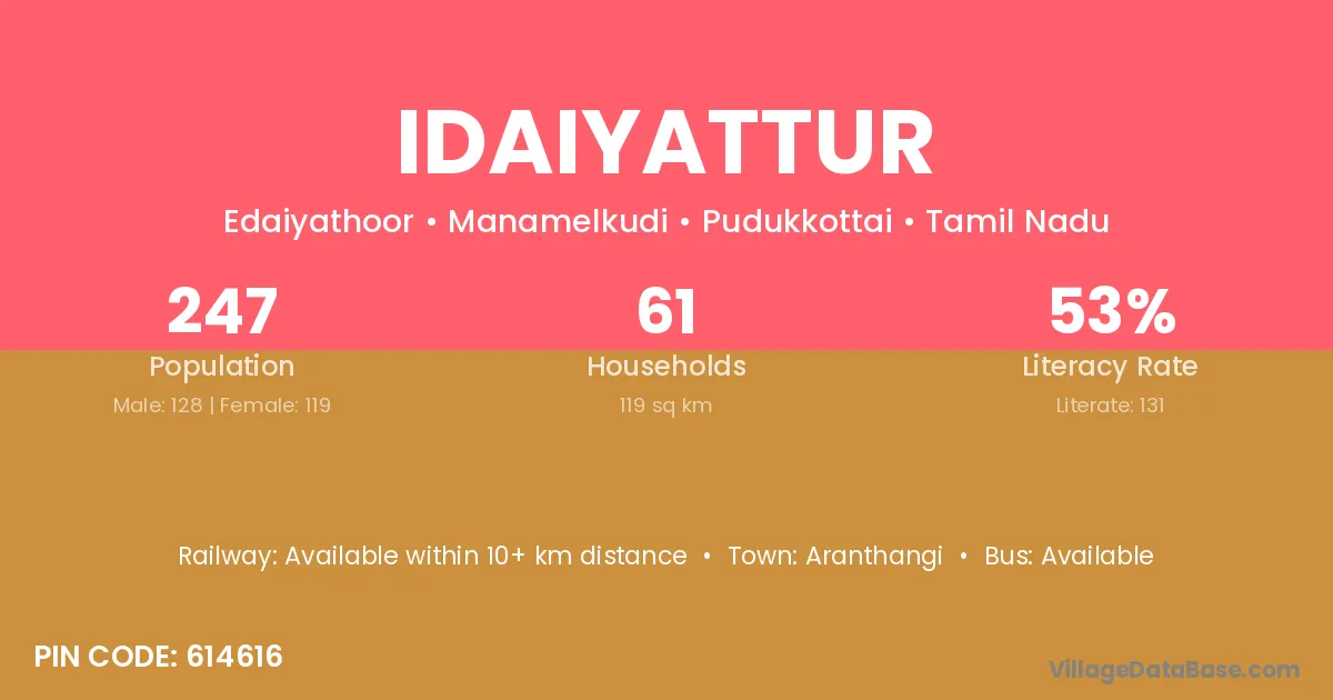 Idaiyattur village has a total population of 247 people, of which 128 are males and 119 are females.