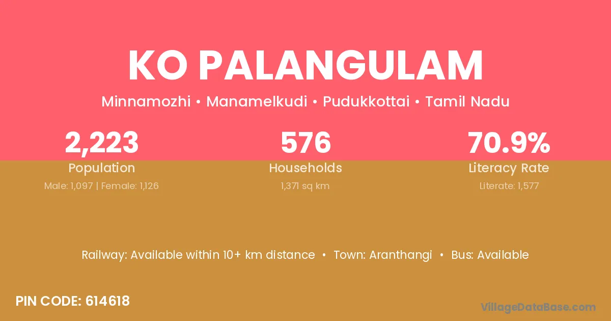 Ko Palangulam village has a total population of 2,223 people, of which 1,097 are males and 1,126 are females.