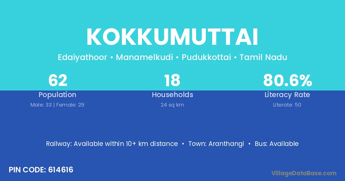 Kokkumuttai village has a total population of 62 people, of which 33 are males and 29 are females.