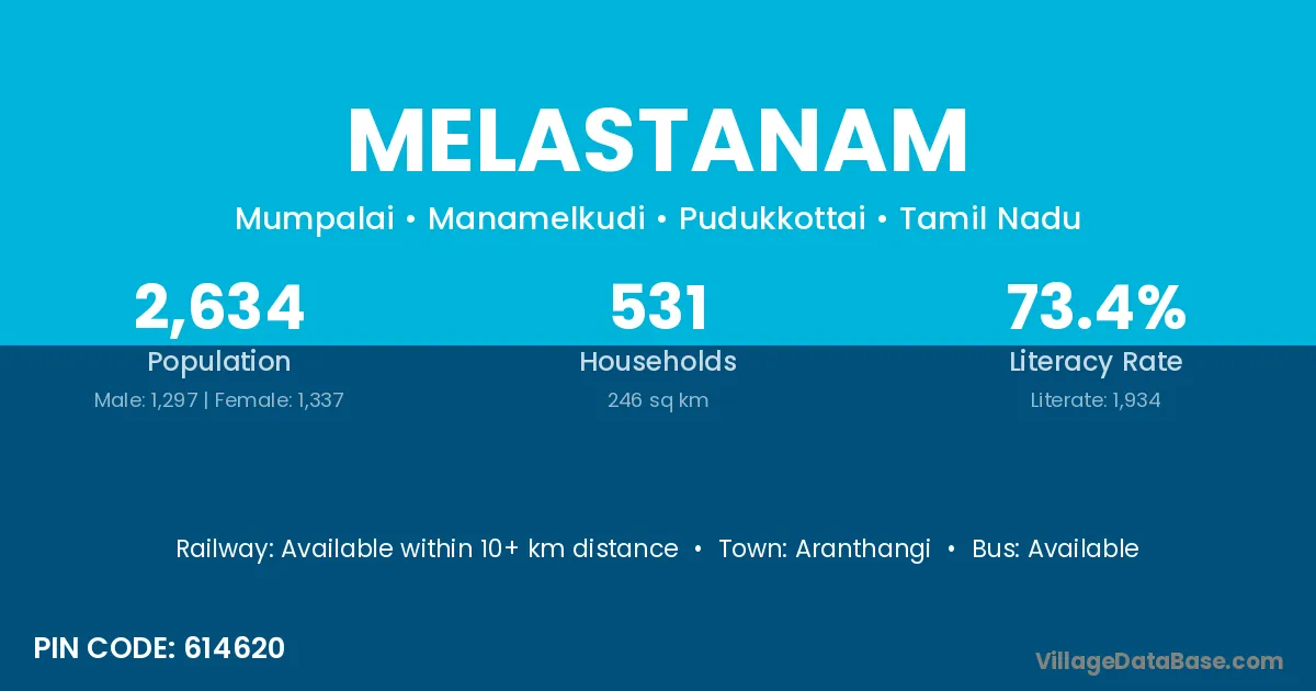 Aranthangi is the nearest town to Melastanam village for major economic activities