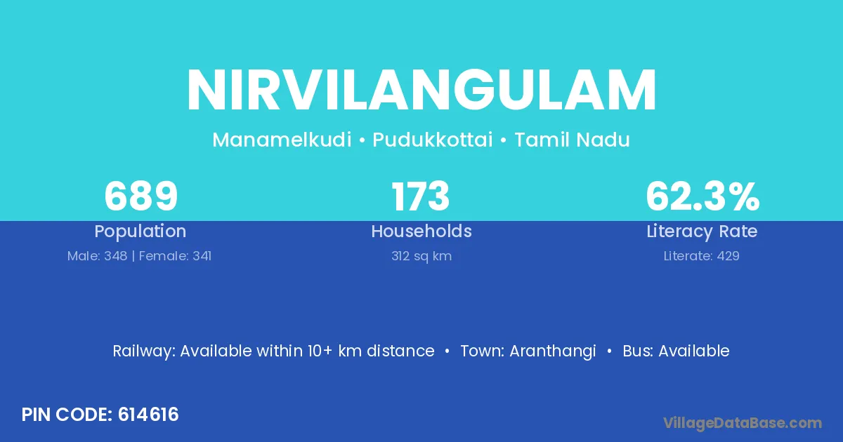 Nirvilangulam village has a total population of 689 people, of which 348 are males and 341 are females.