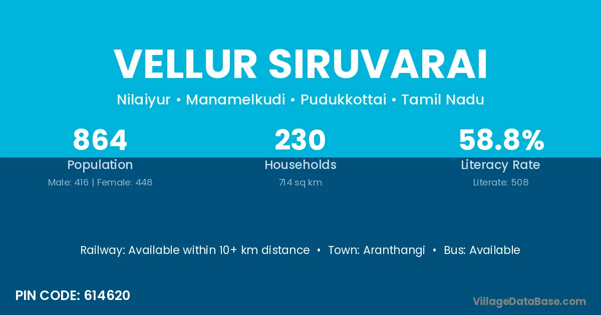 Aranthangi is the nearest town to Vellur Siruvarai village for major economic activities
