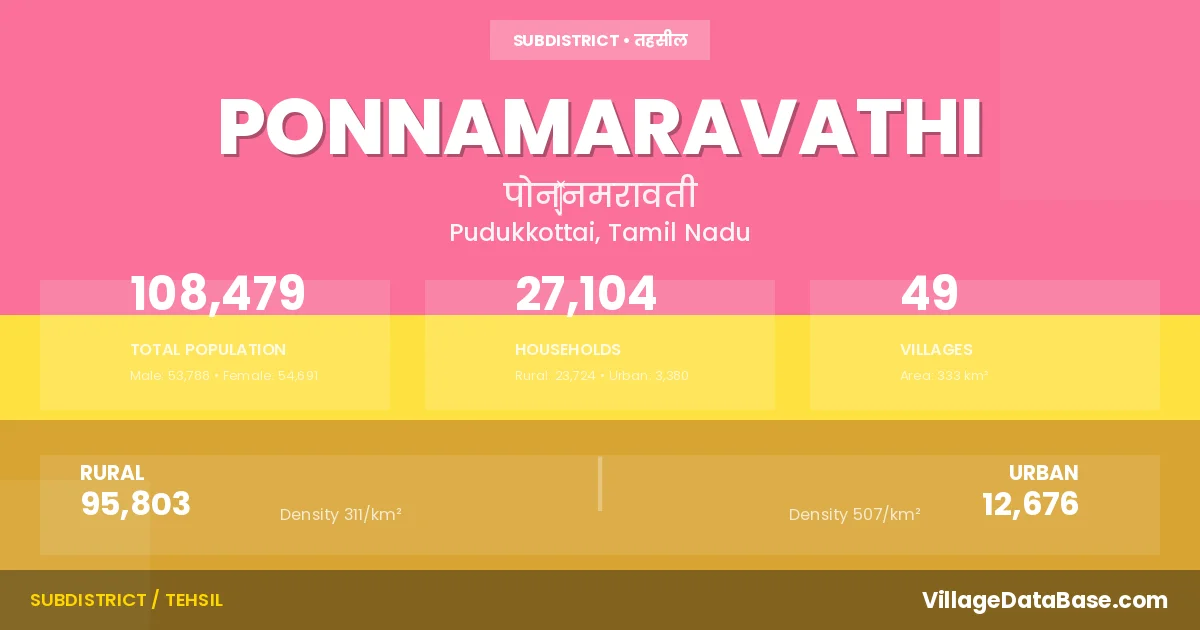According to the 2011 census The total area of Ponnamaravathi Taluka is 333 km², with a population of 108479 people. The population density is 326 inhabitants per square kilometre, and there are approximately 27104 houses in the sub district.