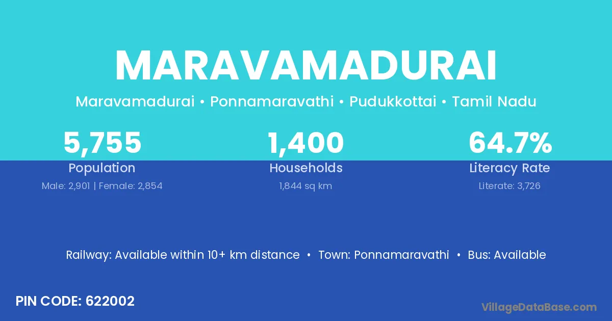 Maravamadurai village has a total population of 5,755 people, of which 2,901 are males and 2,854 are females.