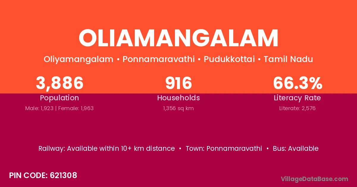 Oliamangalam village has a total population of 3,886 people, of which 1,923 are males and 1,963 are females.