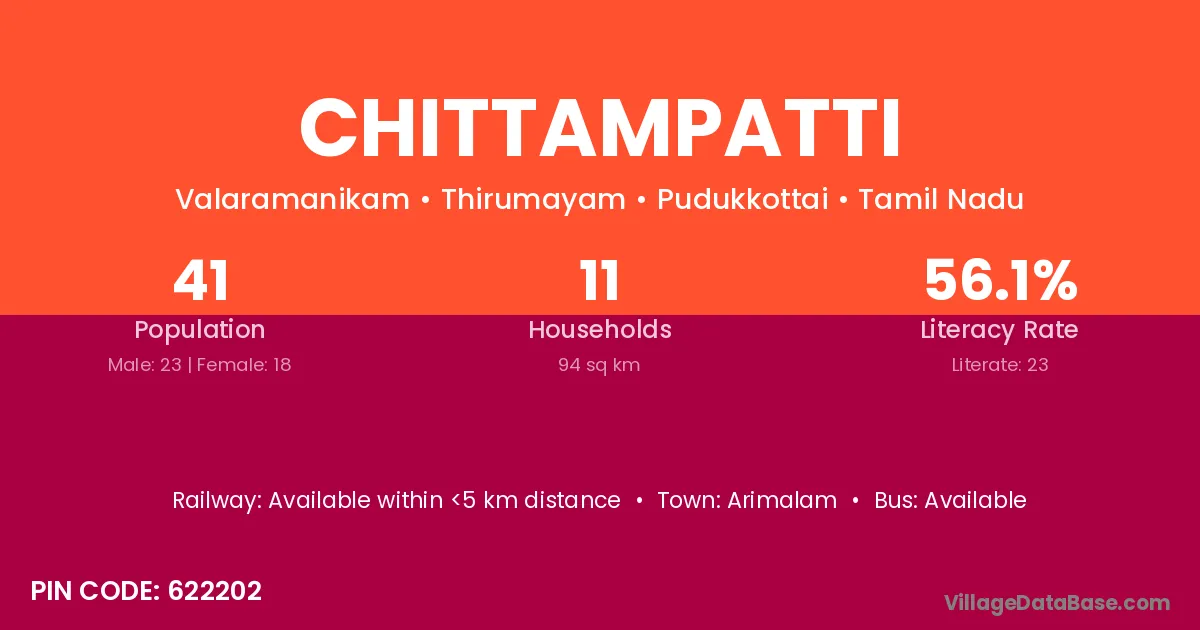 Chittampatti village has a total population of 41 people, of which 23 are males and 18 are females.