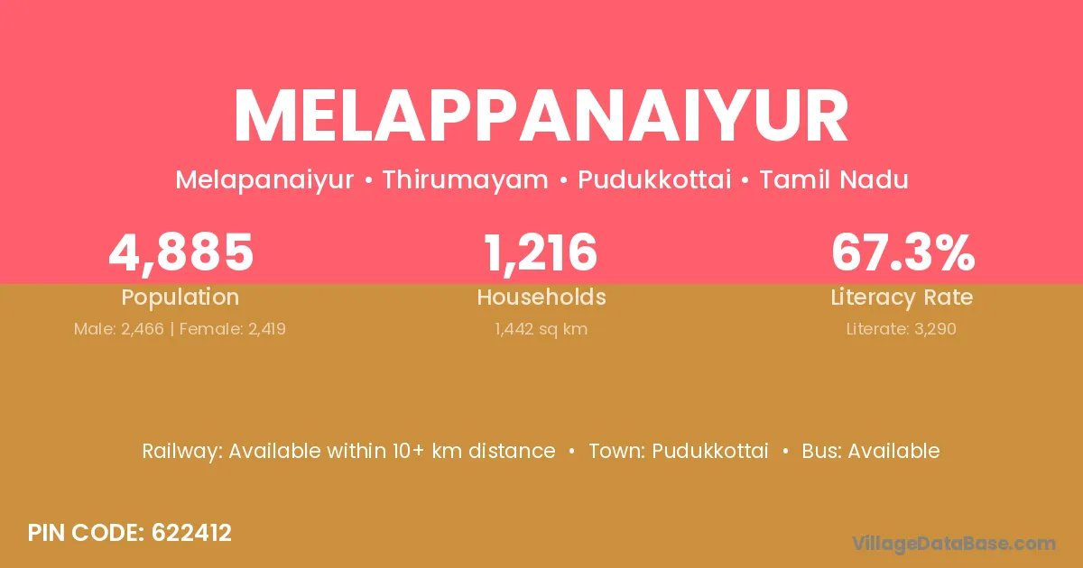 Melappanaiyur village has a total population of 4,885 people, of which 2,466 are males and 2,419 are females.