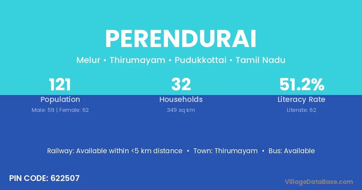 Perendurai village has a total population of 121 people, of which 59 are males and 62 are females.