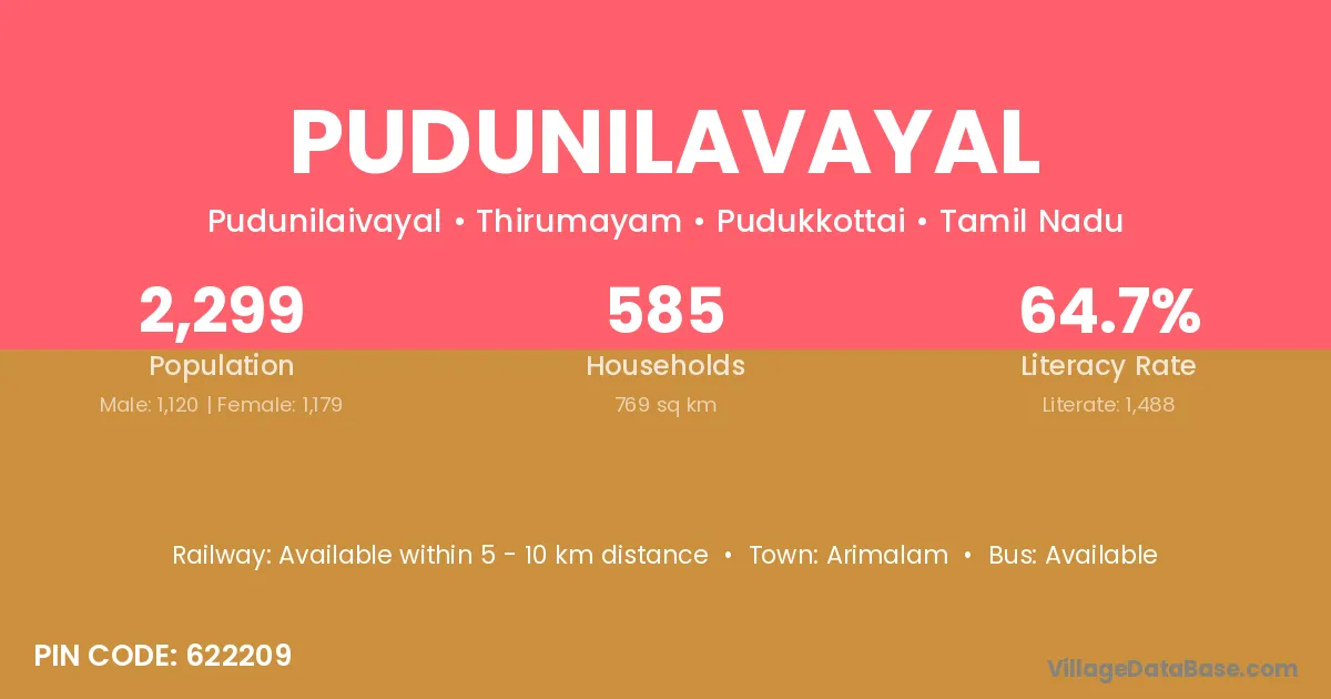 Arimalam is the nearest town to Pudunilavayal village for major economic activities