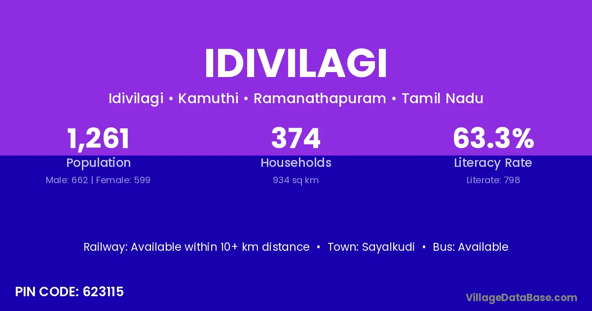 Idivilagi village has a total population of 1,261 people, of which 662 are males and 599 are females.