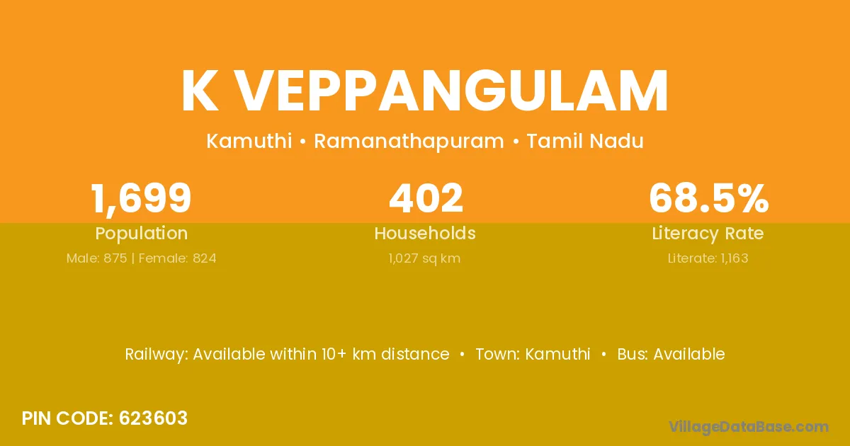 K Veppangulam village has a total population of 1,699 people, of which 875 are males and 824 are females.