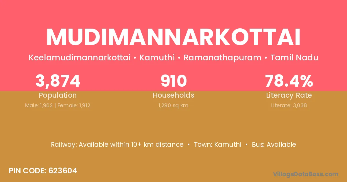 Mudimannarkottai village has a total population of 3,874 people, of which 1,962 are males and 1,912 are females.