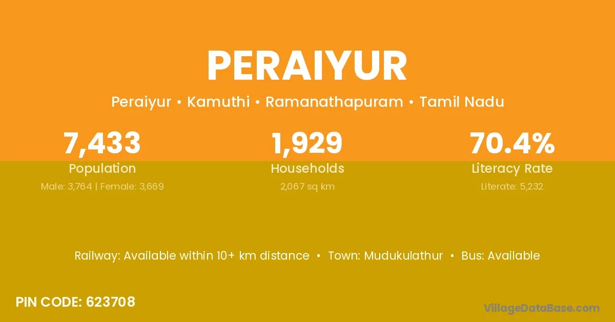 Peraiyur village has a total population of 7,433 people, of which 3,764 are males and 3,669 are females.