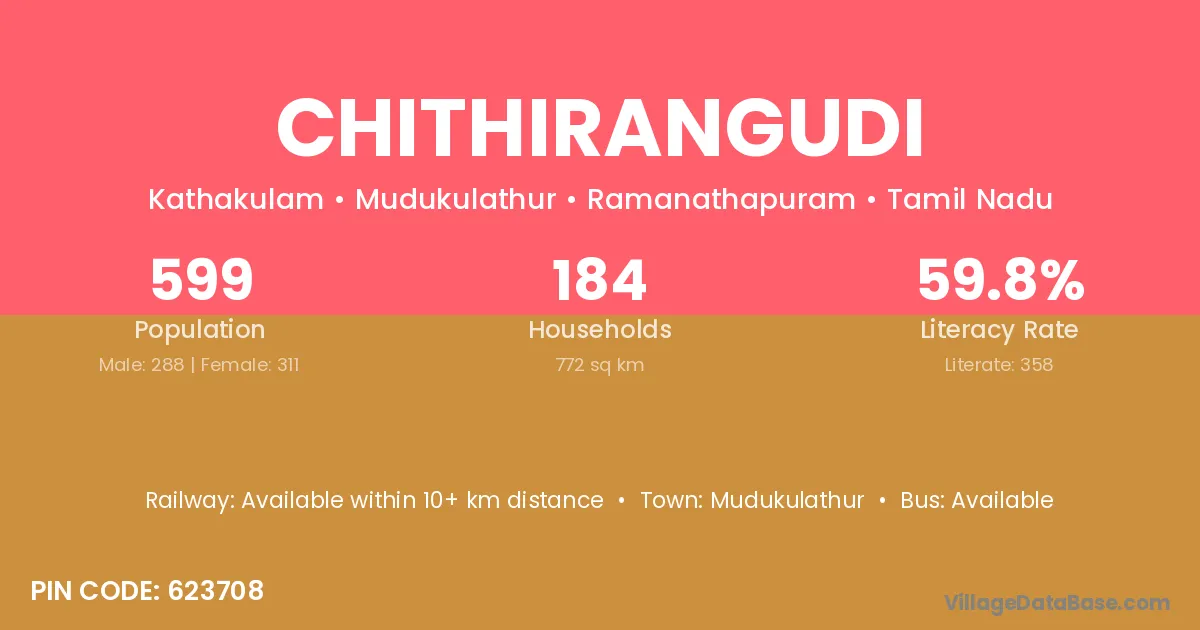 Chithirangudi village has a total population of 599 people, of which 288 are males and 311 are females.