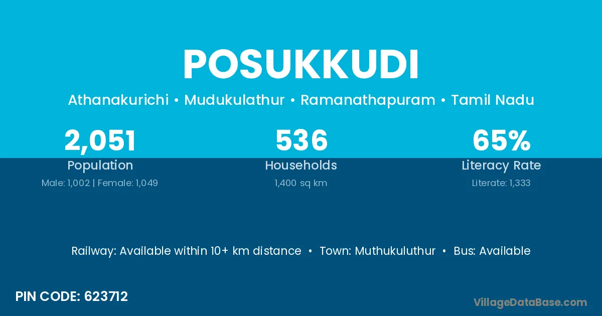 Posukkudi village has a total population of 2,051 people, of which 1,002 are males and 1,049 are females.