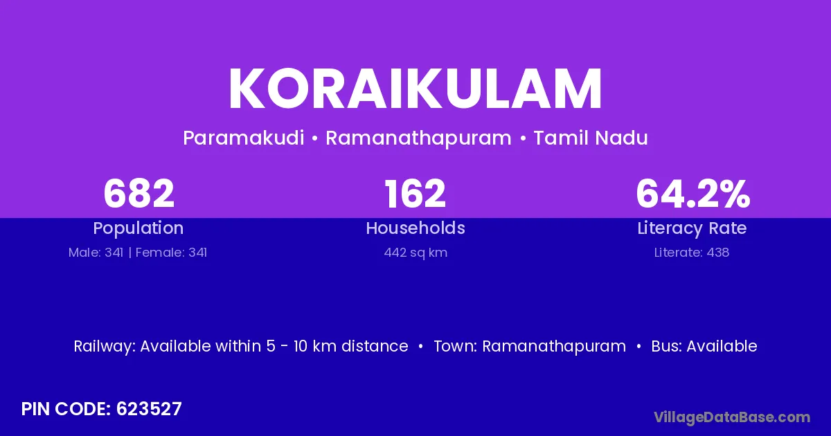 Koraikulam village has a total population of 682 people, of which 341 are males and 341 are females.