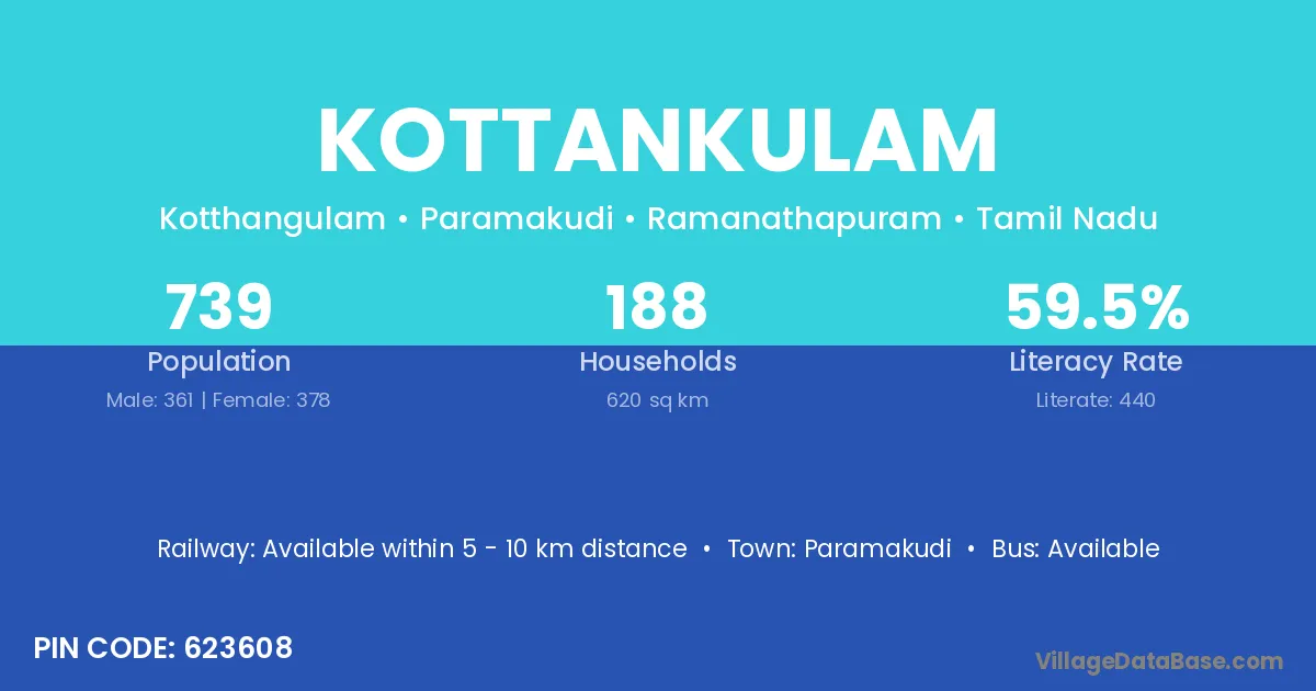 Kottankulam village has a total population of 739 people, of which 361 are males and 378 are females.