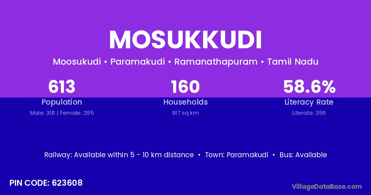 Mosukkudi village has a total population of 613 people, of which 318 are males and 295 are females.