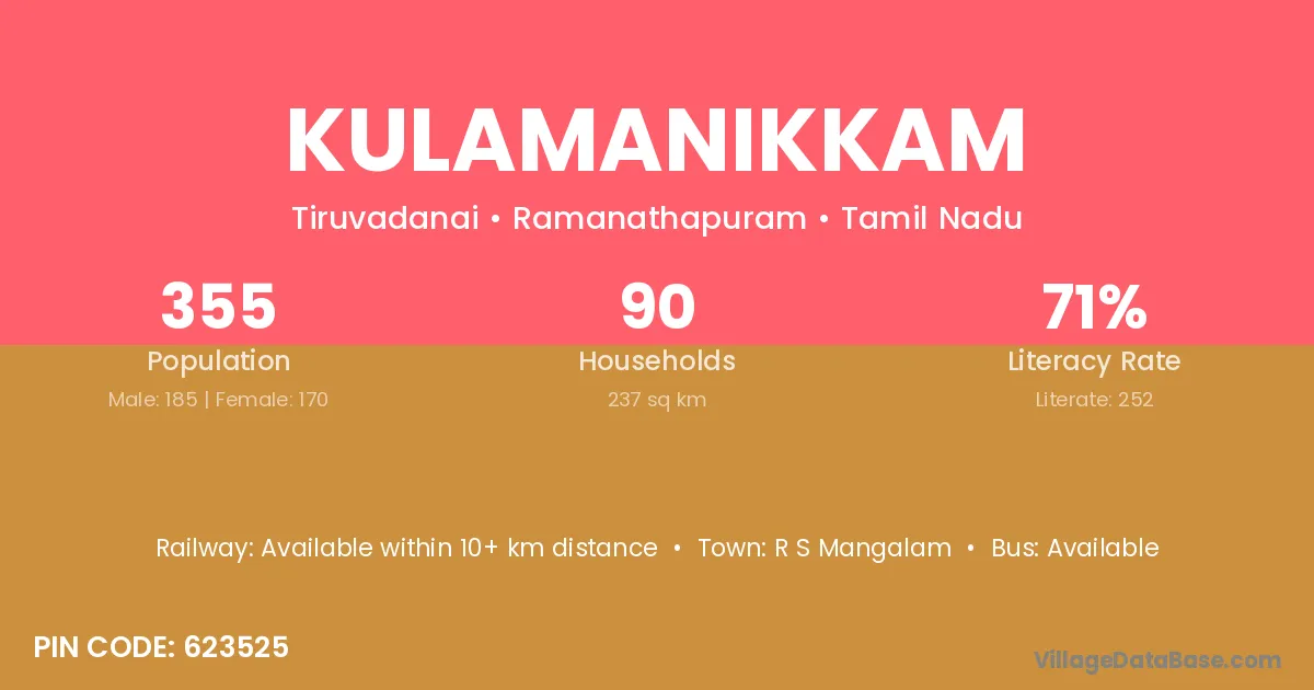 Kulamanikkam village has a total population of 355 people, of which 185 are males and 170 are females.