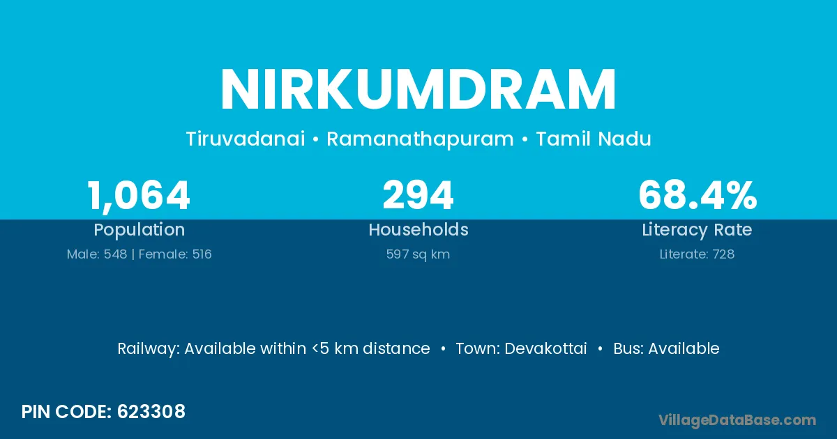 According to Census 2011 information, the village code of Nirkumdram village is 623308.