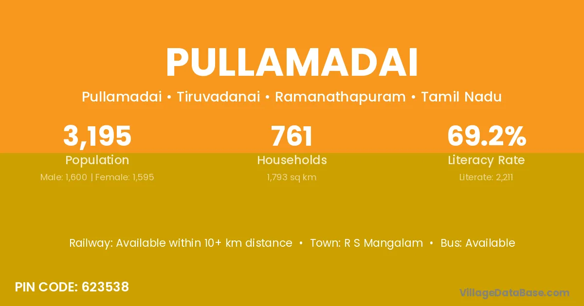 Pullamadai village has a total population of 3,195 people, of which 1,600 are males and 1,595 are females.
