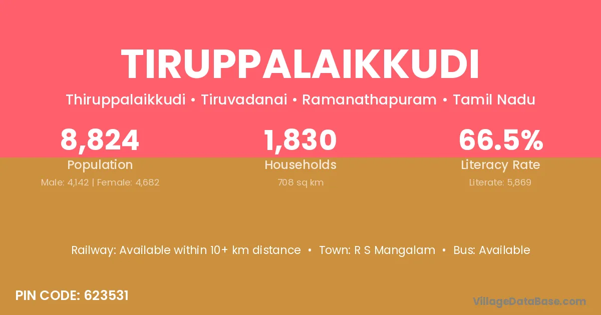 Tiruppalaikkudi village has a total population of 8,824 people, of which 4,142 are males and 4,682 are females.