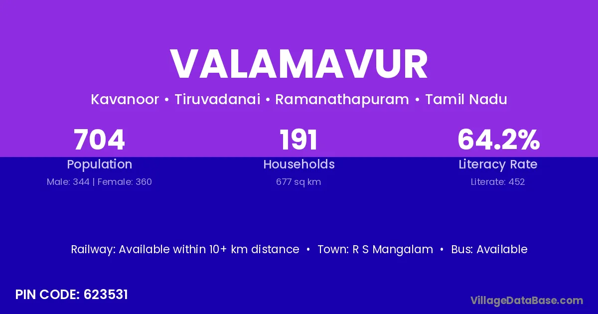 According to Census 2011 information, the village code of Valamavur village is 623531.