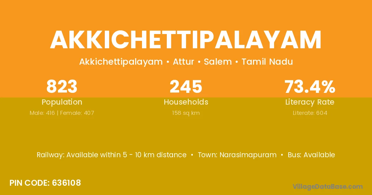 According to Census 2011 information, the village code of Akkichettipalayam village is 636108.
