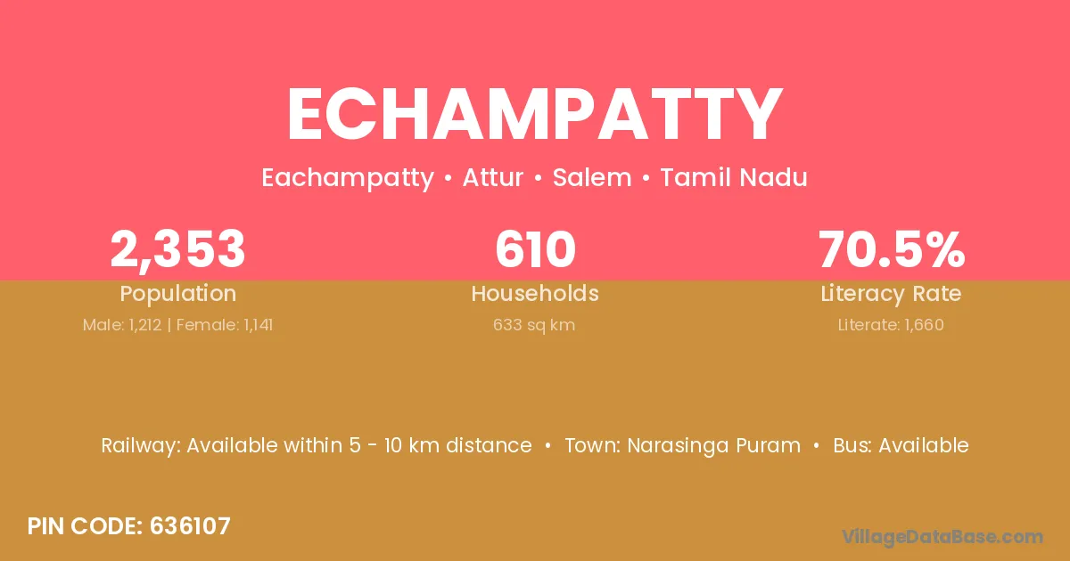 The literacy rate of Echampatty village is 70.55%. Male literacy stands at 79.13% and female literacy at 61.44%.