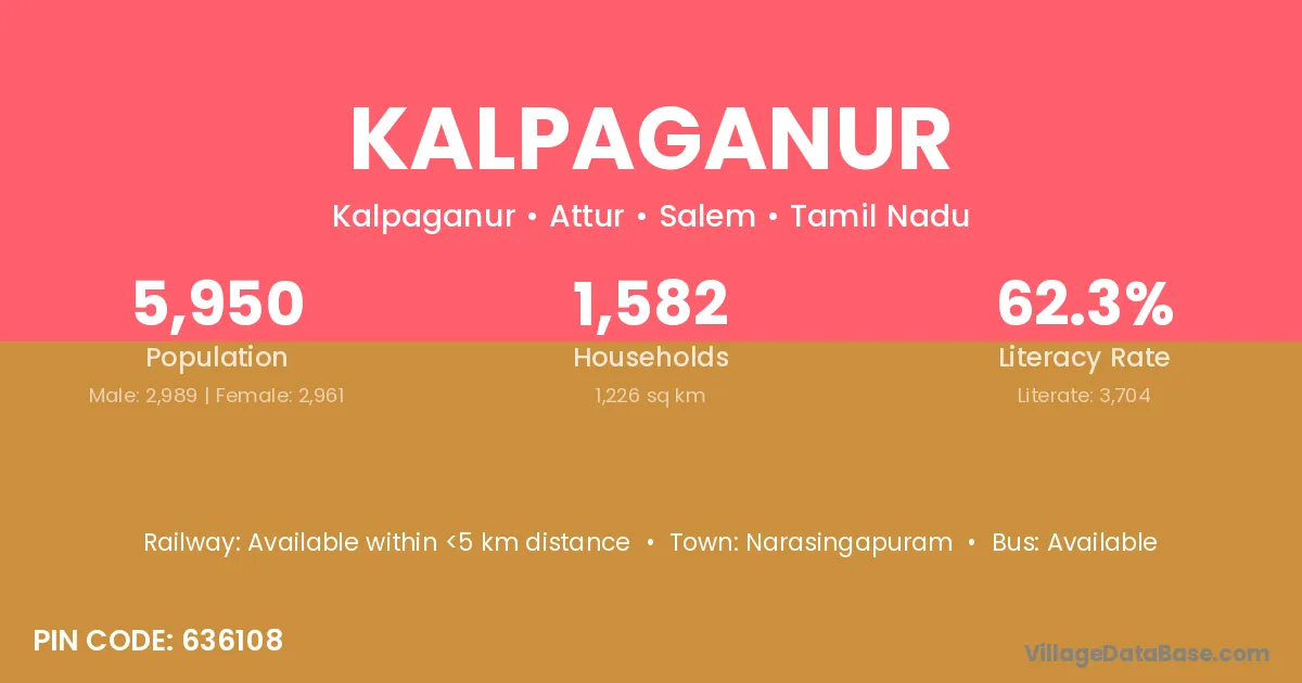 Kalpaganur village has a total population of 5,950 people, of which 2,989 are males and 2,961 are females.