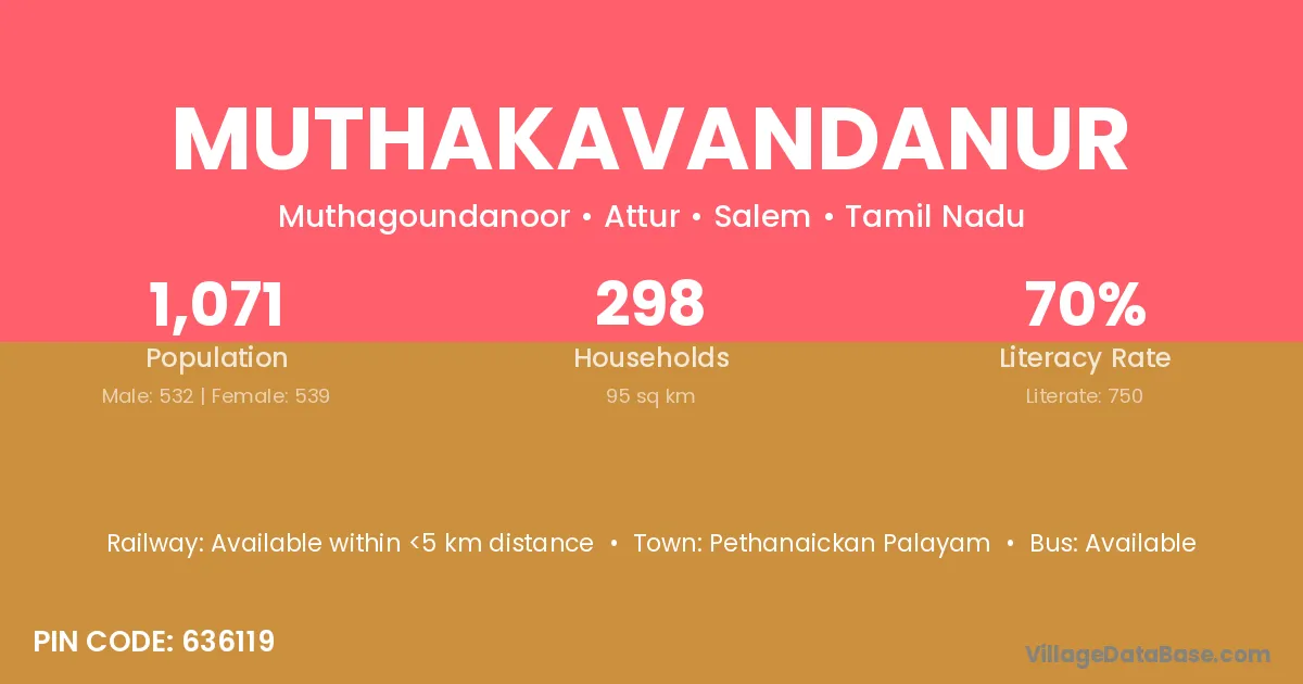 Muthakavandanur village has a total population of 1,071 people, of which 532 are males and 539 are females.