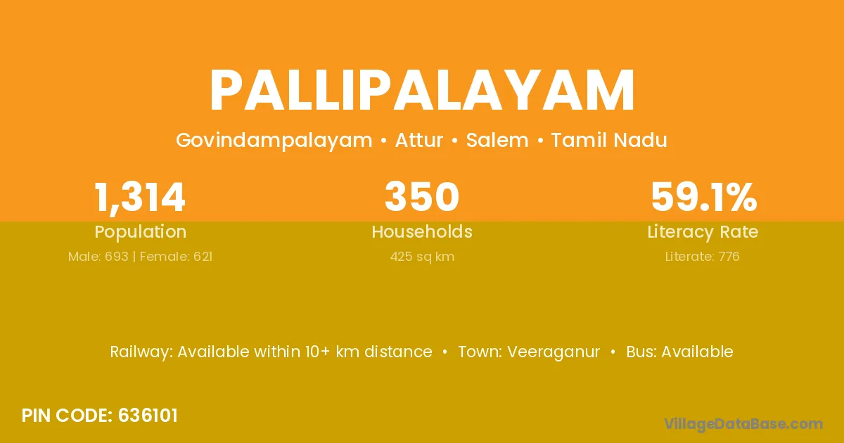 Pallipalayam village has a total population of 1,314 people, of which 693 are males and 621 are females.