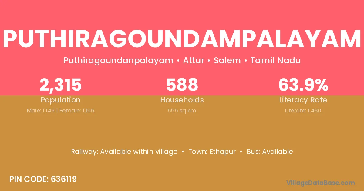 Puthiragoundampalayam village has a total population of 2,315 people, of which 1,149 are males and 1,166 are females.